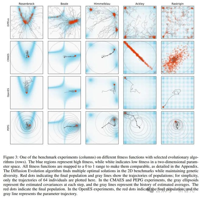 研究人员在多个二维优化场景中进行了实验(Rosenbrock和Beale有一个最优值,Himmelblau、Ackley和Rastrigin有多个最优值),并与其他进化算法(CMA-ES、OpenES和PEPG)做出比较。