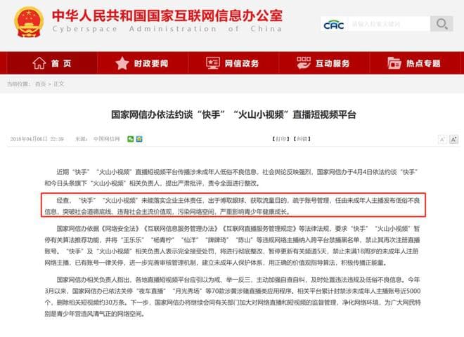 国家网信办官网显示,因被指传播涉未成年人低俗信息,2018年4月,国家网信办依法约谈“快手”“火山小视频”直播短视频平台负责人。