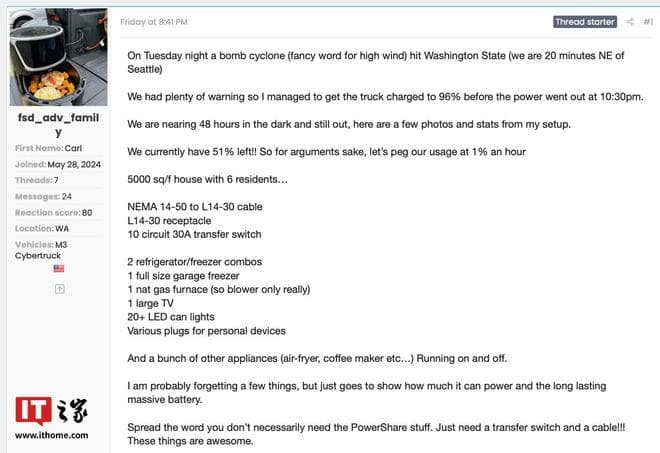IT之家 11 月 24 日消息,一名名为 fsd_adv_family的博主发帖声称自己的特斯拉Cybertruck皮卡在96%电量下为其停电房屋连续供电48小时,之后汽车还剩51%电量。