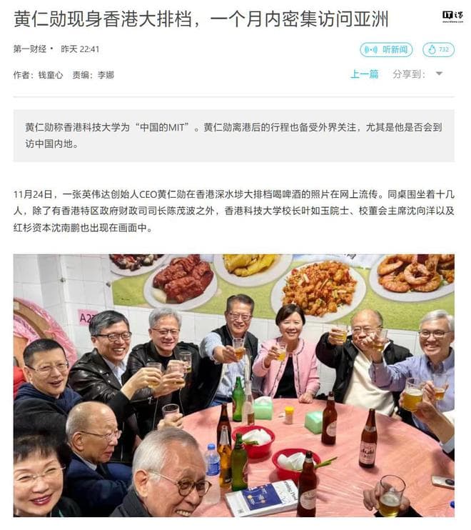 IT之家 11 月 25 日消息,英伟达创始人兼 CEO 黄仁勋近日现身香港,被拍到在深水埗大排档喝啤酒,同桌围坐着香港特区政府财政司司长陈茂波、香港科技大学校长叶如玉院士、校董会主席沈向洋、红杉资本沈南鹏等十几人。