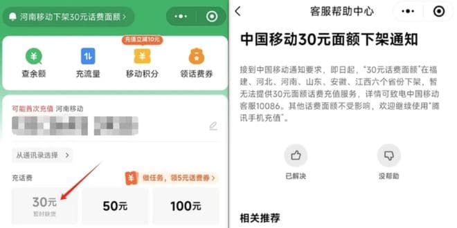 腾讯手机充值客服帮助中心发布的通知显示,接到中国移动通知要求,即日起,“30元话费面额”在福建、河北、河南、山东、安徽、江西六个省份下架,暂无法提供30元面额话费充值服务。支付宝手机充值公告显示,自2024年11月20日起,中国移动将不再为第三方提供20元和30元面额的充值服务。
