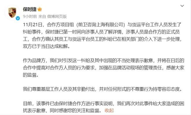 11月23日,一段“货拉拉司机向保时捷工作人员维权”的视频在社交平台热传。该司机称保时捷工作人员拖欠600元运费并导致其账号被封,同时疑似有推搡行为。当晚,保时捷在微博上发布声明,对纠纷及不当处理表示歉意,并已第一时间向涉事人员了解详情,涉事人员是合作方的正式员工,合作方确认其员工与货运平台员工的纠纷已在相关部门的介入下进一步处理,双方已于当日达成和解。