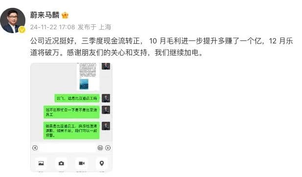 11月22日,比亚迪集团品牌及公关处总经理李云飞在其个人微博上发文称,“网传的比亚迪与蔚来汽车相关的投资及合作信息,为严重不实信息!请大家不信谣,不传谣”。上述消息也引起了蔚来公司助理副总裁马麟的关注。11月22日,马麟在其个人微博上发文回应称,“公司近况挺好,三季度现金流转正,10月毛利进一步提升,12月乐道将破万(辆)。感谢朋友们的关心和支持,我们继续加电。”