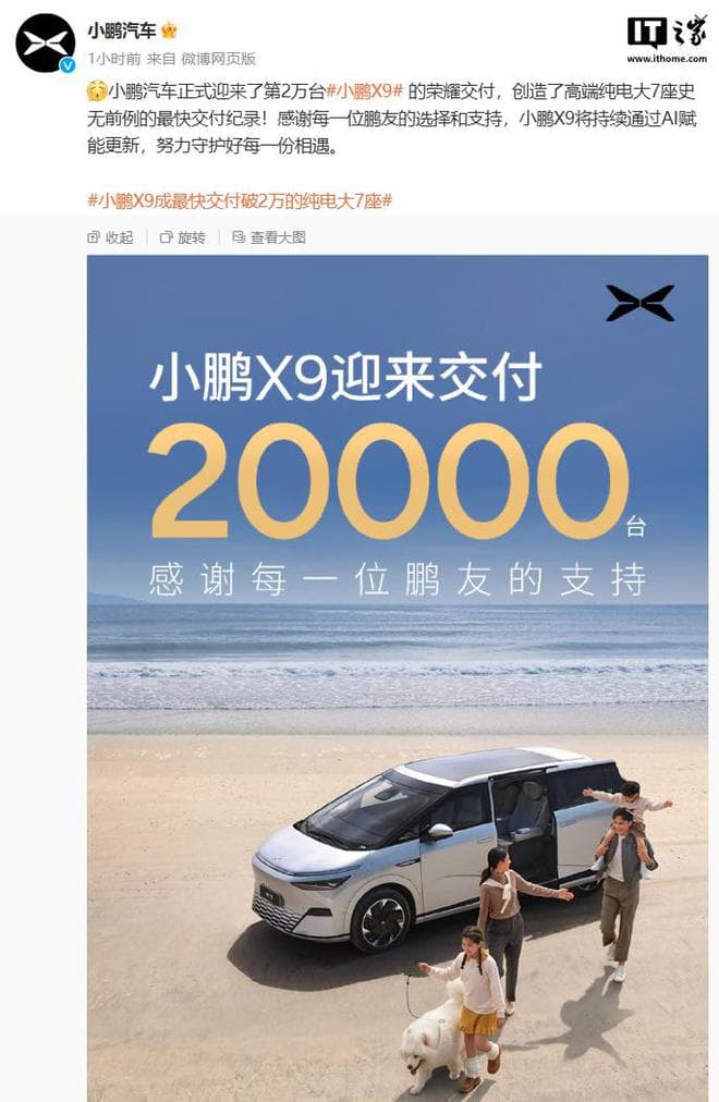 小鹏 X9 迎来第 2 万台交付,创高端纯电大 7 座最快交付纪录