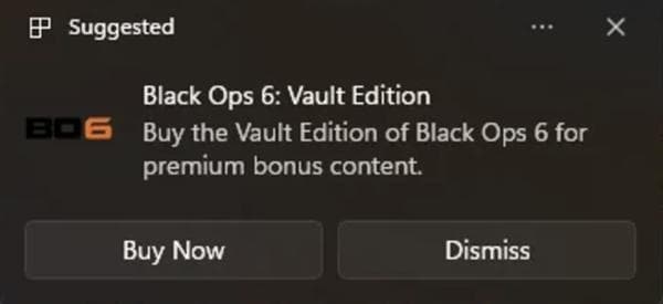 微软最近看来是在Windows 11系统通知中推荐《使命召唤:黑色行动6》金库版,并引导用户前往微软应用商店购买。