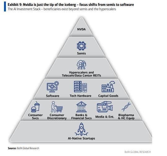 美银进一步指出,随着AI应用的普及,市场焦点也转移到AI受益者的第二阶段: