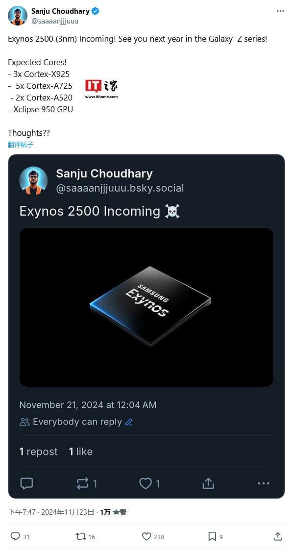 IT之家 11 月 25 日消息,消息源 @saaaanjjjuuu 于 11 月 23 日在 X 平台发布推文,曝料称三星计划明年推出的 Galaxy Z 系列折叠手机中,装备 3nm 工艺的 Exynos 2500 芯片。