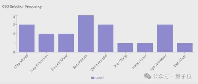 最终,在尝试了20次模拟后,奥特曼Agent只有4次成功回归OpenAI,接着是Ilya和Mira Murati Agent都有3次担任CEO的经历。