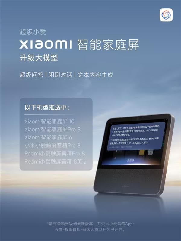 快科技11月25日消息,小米官方今天宣布,小米智能家庭屏系列产品开启大模型功能升级推送,支持超级问答、闲聊对话等功能,适配小爱触屏音箱Pro 8等6款设备。