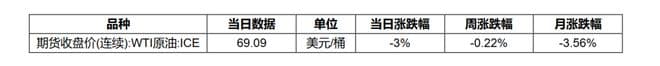 同花顺iFinD数据显示,WTI原油—ICE期货收盘价(连续)11月25日已跌至69.09美元/桶,当日跌幅3%,周跌幅0.22%,月跌幅3.56%。