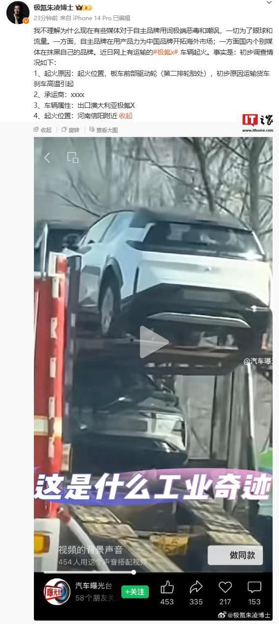 IT之家 11 月 26 日消息,极氪智能科技副总裁朱凌今日发文对“网上有运输的极氪 X 车辆起火”的实际情况进行说明,IT之家附微博原文内容如下: