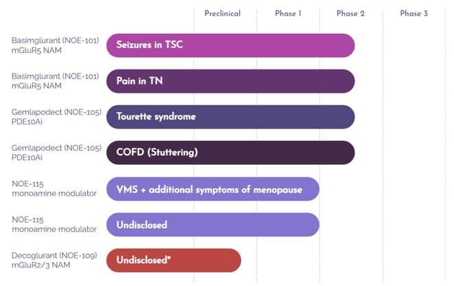 除了结节性硬化症相关癫痫,NOE-101还可用于三叉神经疼痛控制,其作用机制为减少涉及三叉神经痛的过度信号的痛觉回路,从而降低对疼痛阈值的感知。此外,Noema Pharma还开发了Gemlapodect(NOE-105)与NOE-115管线产品。Gemlapodect(NOE-105)是一种有效的选择性PDE10A抑制剂,用于治疗抽动秽语综合征与童年期发病的语言流畅性障碍(COFD,即口吃),目前研究已进入临床2B期。NOE-115是一种广谱单胺调节剂,用于治疗非典型抑郁症和暴食症,目前研究已进入临床2期。