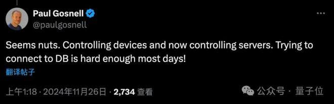 也有开发者表示“看起来很疯狂”,Claude在接管个人电脑之后,再次接管了服务器。自己此前光是让AI连接数据库都很费劲。