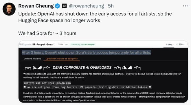 Sora遭“报复性”泄露!艺术家公开抗议:不是你的无偿研发人员