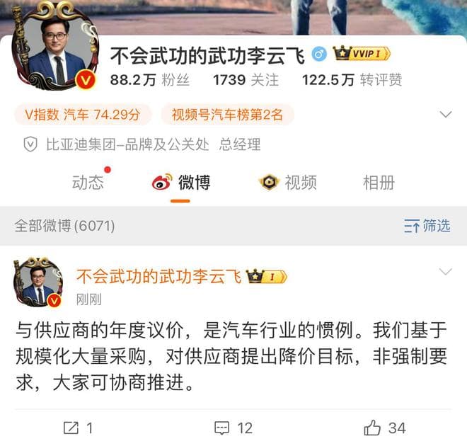 财联社11月27日电,比亚迪集团-品牌及公关处总经理27日在微博上发文表示,与供应商的年度议价,是汽车行业的惯例。我们基于规模化大量采购,对供应商提出降价目标,非强制要求,大家可协商推进。