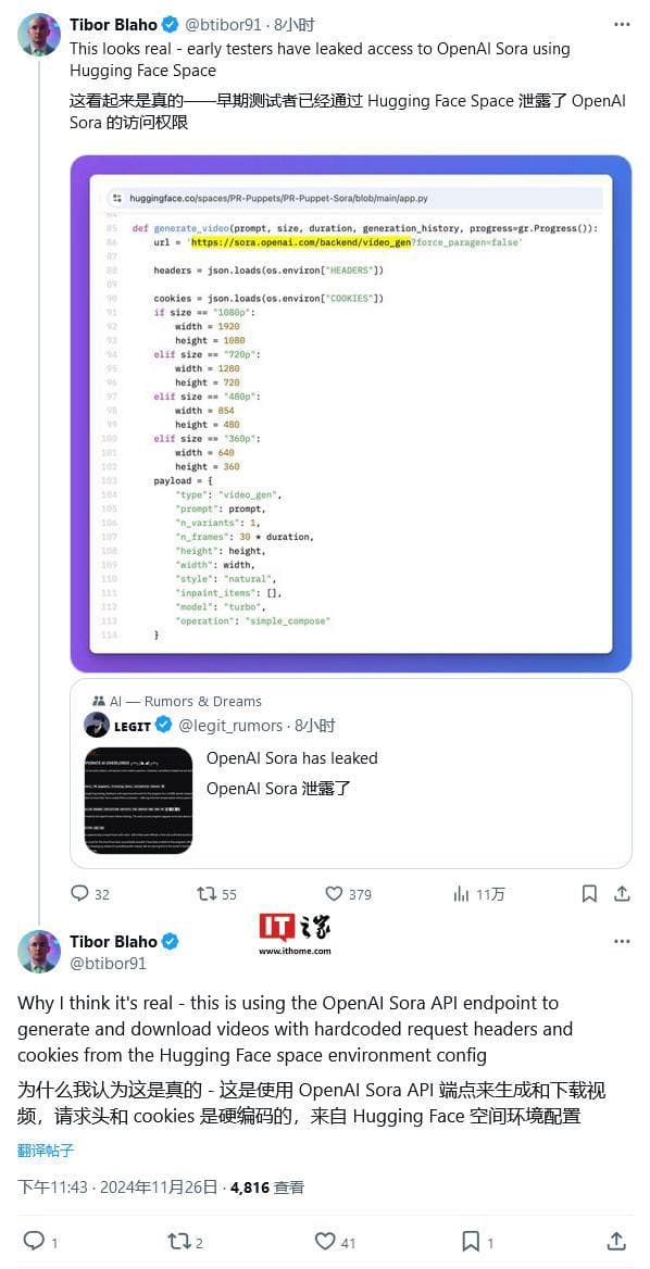 10 秒 1080P:OpenAI 视频生成 AI 模型 Sora 遭泄露