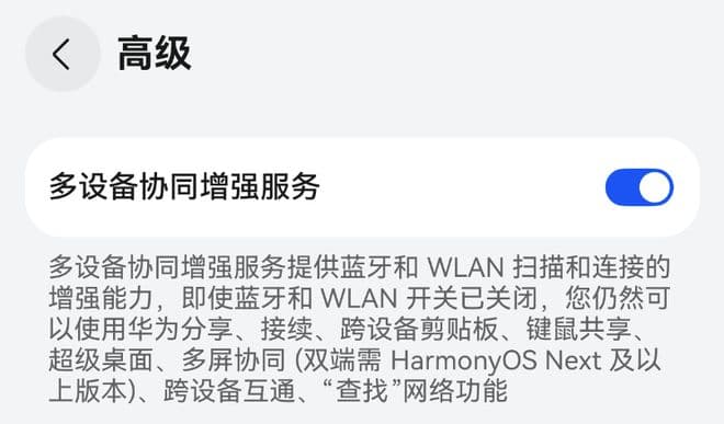 除了这个酷炫的新功能之外,我们在 HarmonyOS NEXT 的设置里,发现了一个叫 “ 多设备协同增强服务 ” 的开关,打开这个开关之后,神奇的事情就发生了——
