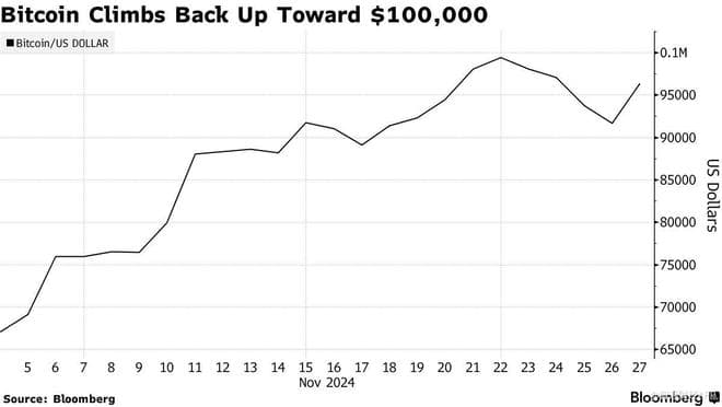 自美国大选以来,比特币已经上涨了约40%,因为交易员们预计,在特朗普表示支持加密货币行业的情况下,加密货币的监管环境将更加友好。该代币在上周五达到99728美元的历史新高,然后在过去四天下跌。周三,比特币一度攀升6%,至97361美元。今年以来,比特币已上涨一倍多。