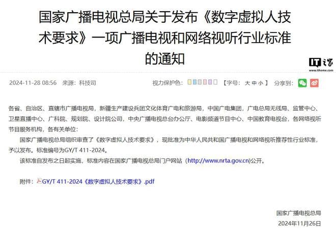 IT之家 11 月 28 日消息,国家广播电视总局组织审查了《数字虚拟人技术要求》,现批准为中华人民共和国广播电视和网络视听推荐性行业标准,予以发布。标准编号为 GY / T 411-2024,该标准自发布之日起实施。