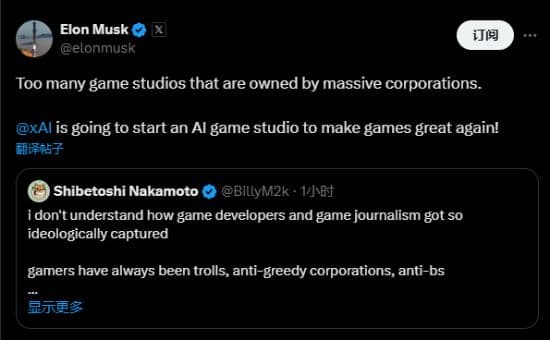 在此背景下,马斯克今日在推特发文,表示“太多游戏工作室已经被大型企业所收购。为了让游戏再次变得伟大,我宣布旗下的人工智能公司xAI将成立一家AI游戏工作室。”这番话表明,马斯克不仅对游戏行业现状感到不满,还希望借助自己的技术背景,通过创新的方式推动游戏行业的发展。