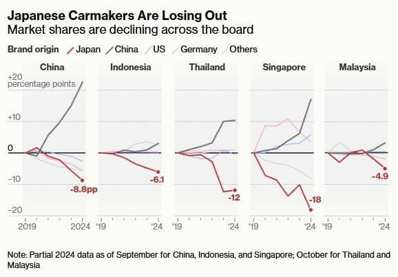 2019年到2024年期间,日本汽车制造商在中国、新加坡、泰国、马来西亚和印度尼西亚等国的市场份额出现了急剧下降,在泰国和新加坡,日本汽车制造商目前只占市场份额的35%,远低于2019年的50%——曾经开满日本汽车的街头,出现越来越多的中国品牌。