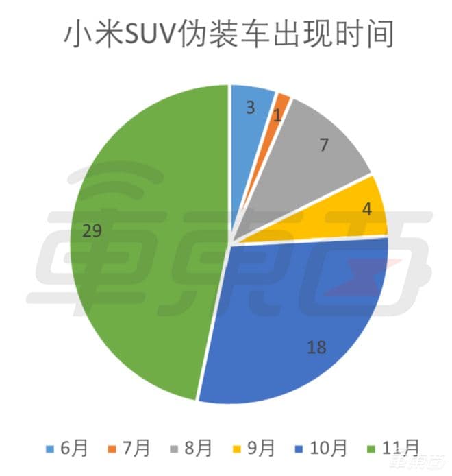 通过对以上信息的仔细整理,车东西发现,从6月20日开始至11月28日,车东西搜集到的小米SUV伪装车谍照出现的次数按月分布分别是:6月3次、7月1次、8月7次、9月4次、10月18次、11月29次。