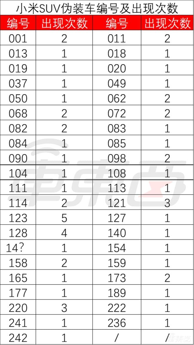 从编号来看,包括车东西拍到和网络上的照片来看,已经有至少42个不同编号被目击到,目前最大的编号为242号,从这些伪装车的编号来看,小米汽车目前可能已经生产了近300台试制车在全国各地进行测试。