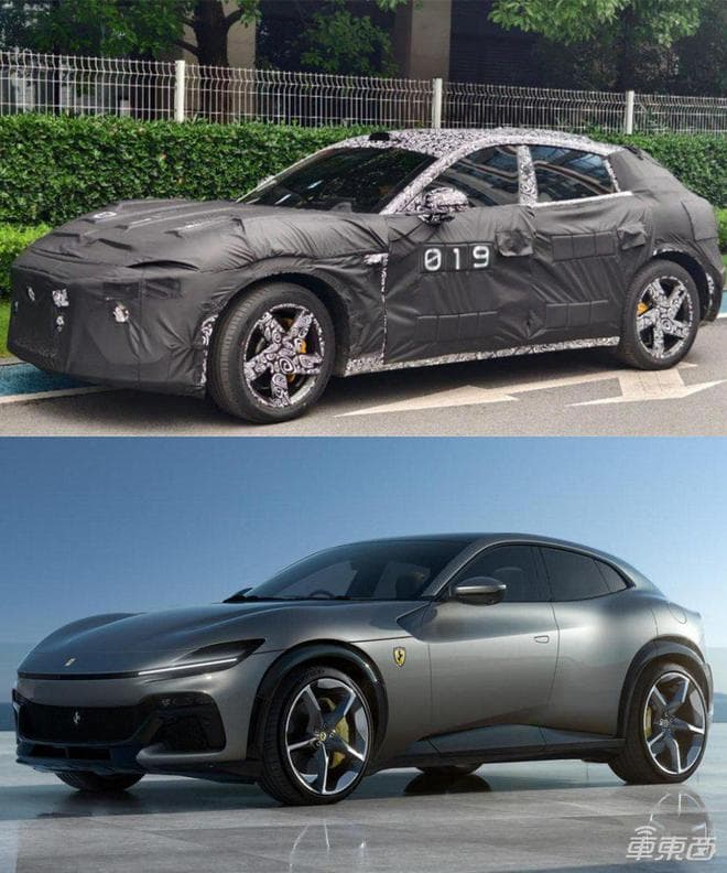 ▲019号小米SUV伪装车谍照(上)和法拉利Purosangue(下)