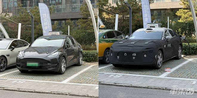 车高方面,车东西把特斯拉Model Y停到了18号停车位中,在找到了同样的拍摄角度后,注意后方的充电桩上的显示屏,可以看到小米SUV伪装车与特斯拉Model Y的高度类似,稍微矮一些。