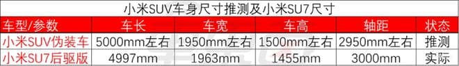 总结来看,小米SUV伪装车推测的长为4900mm到5000mm左右,宽1950mm左右,高1500mm左右,轴距在2950mm左右。