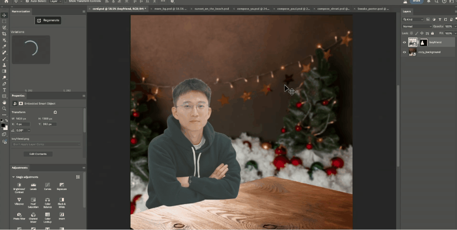 在咱们更常用的 PS 的 P 图功能,这次的新能力 不仅可以把主体 P 上去,还能自动匹配图片里的光影和颜色。