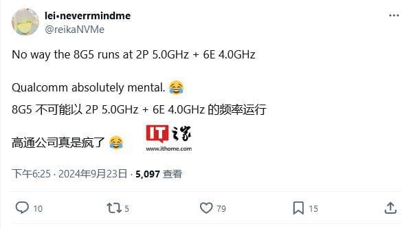 此前消息称高通第二代骁龙 8 至尊版芯片将沿用第一代的 CPU 集群设计,依然为 2P+6E 配置,不过主频会提高到 5.0 GHz。