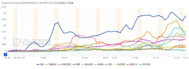 可以看出,Learna在印度市场的下载量遥遥领先,总下载占比超21%,其次为巴基斯坦,下载占比超10%。