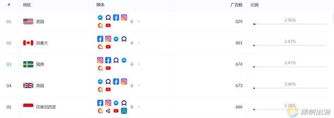 值得注意的是,Learna广告投放地区排名前五的分别是美国、加拿大、瑞典、英国和印尼。