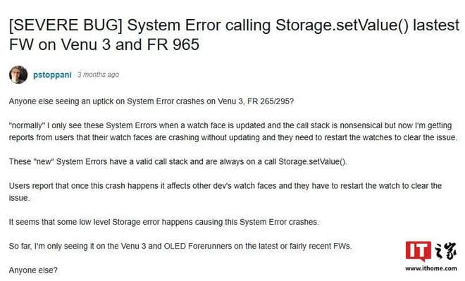 IT之家查询公开资料,有开发者深入挖掘,表示问题的核心是 Garmin Connect IQ 平台中 Storage.setValue () 函数导致系统错误,当应用程序或表盘尝试使用此函数保存数据时,会发生此错误。