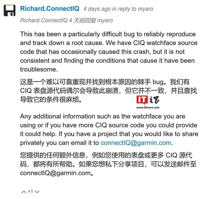 佳明 Richard.ConnectIQ 回复如下:“这是一个难以可靠重现并找到根本原因的棘手 bug。我们有 CIQ 表盘源代码偶尔会导致此崩溃,但它并不一致,并且查找导致它的条件很麻烦。”