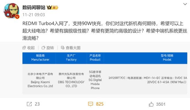而在K80之下,REDMI可能还要在12月推出一款定位更低的机型——Turbo 4。日前该机型已入网,配备90W快充技术。数码博主曝出的信息称,REDMI Turbo 4搭载1.5K直屏,电池容量为6500mAh,或将首发天玑8400处理器。