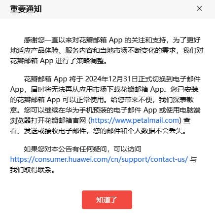 官方表示,为了更好地适应产品体验、服务内容和当地市场不断变化的需求,华为对花瓣邮箱App进行了策略调整。