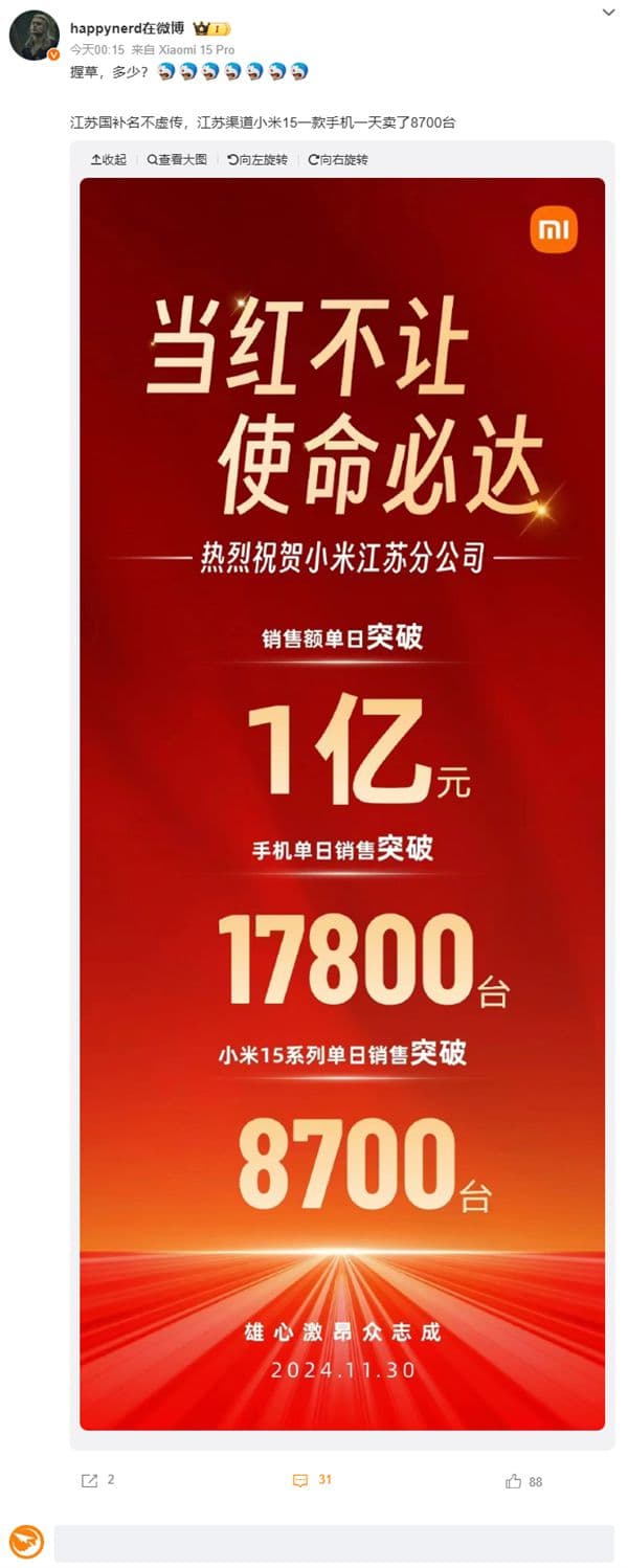 博主晒出的战报显示,11月30日,小米江苏分公司销售额单日突破1亿元、手机单日销售突破17800台,其中小米15系列单日销售突破8700台。
