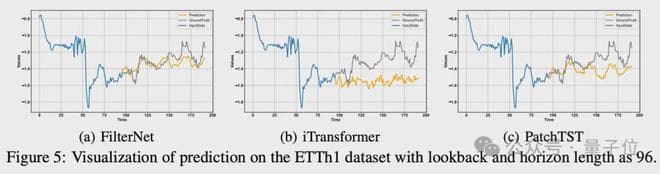 此外,如图8所示,在ETTm1数据集上针对不同预测长度进行的可视化实验进一步证明了FilterNet的强大处理能力。