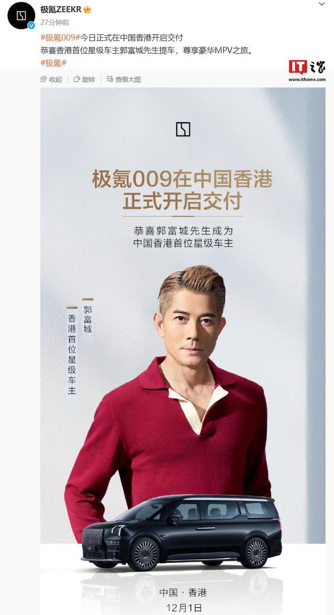 IT之家 12 月 1 日消息,极氪官方今日发文宣布,极氪 009 汽车今日正式在中国香港开启交付,香港首位星级车主为郭富城。