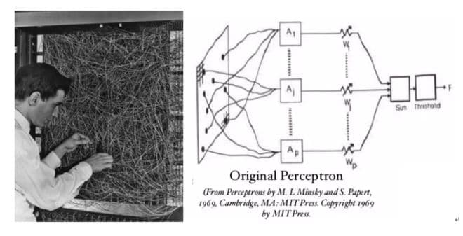 ▷图2:左边为Rosenblatt的物理感知机,右边为感知器系统结构