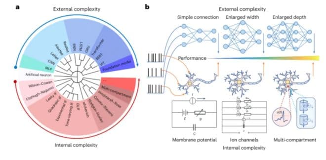 多样化的神经元模拟和网络结构显示出不同级别的复杂性。具有更丰富动态描述的神经元的内部复杂性较高,而具有更宽和更深连接的网络的外部复杂性较高。从复杂性的角度来看,目前通常认为,有望实现通用人工智能的路径有两条,一种是外部复杂性大模型方法,例如通过增加模型的宽度和深度;另一种是内部复杂性小模型方法,例如通过向模型添加离子通道或将其转换为多区室模型。