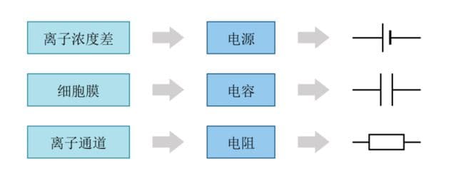 等效电路模型通过使用电路元件来模拟神经细胞膜的电生理性质,使得复杂的生物电现象可以在物理和工程的框架内得到解释和分析。等效电路模型,通常包括膜电容、膜电阻、电源这3个基本元件。