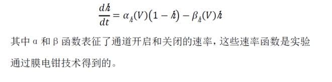 基于等效电路的思想,Alan Hodgkin和Andrew Huxley在20世纪50年代基于他们对乌贼巨神经元的实验研究提出了HH(Hodgkin-Huxley)模型,模型中包括钠(Na)、钾(K)和漏电流(Leak Current)的电导,可以表示每种离子通道的开启程度,在模型中离子通道的开闭进一步通过门控变量描述,这些变量(m、h、n)具有电压依赖性和时间依赖性。HH模型的方程为: