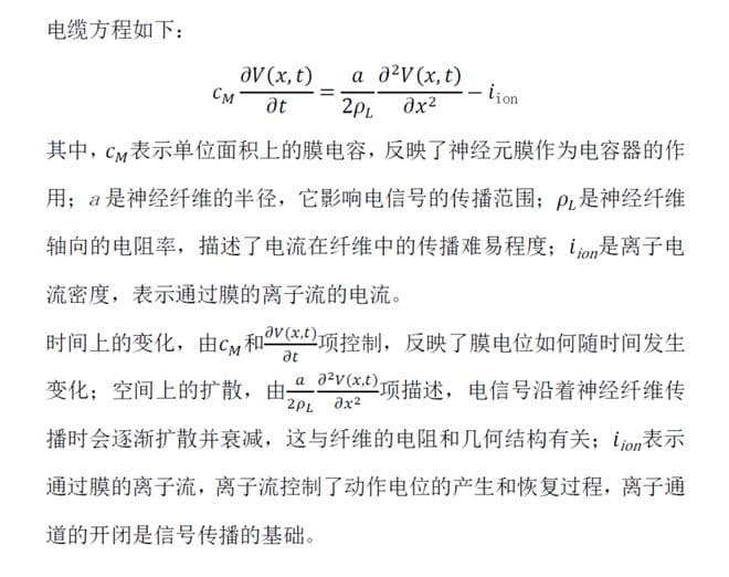 19世纪末至20世纪初,科学家们开始认识到,神经元中的电信号可以通过轴突、树突等细长的神经纤维进行传播。然而,随着距离的增加,信号会发生衰减。科学家们需要一种理论工具来解释电信号在神经纤维中的传播过程,特别是在长距离上传播时的电位变化规律。