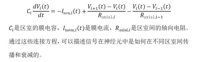 具体来说,神经元被分成多个小区室,每个区室代表神经元的一部分(如树突、轴突或细胞体的一段)。每个区室用电路模型表示,电阻和电容用以描述膜的电学特性,跨膜电位由电流注入、扩散和漏电等因素决定。邻近区室通过电阻连接,电信号通过这些连接在区室间传播。跨膜电位Vi在第i个区室中遵循类似于电缆理论的微分方程: