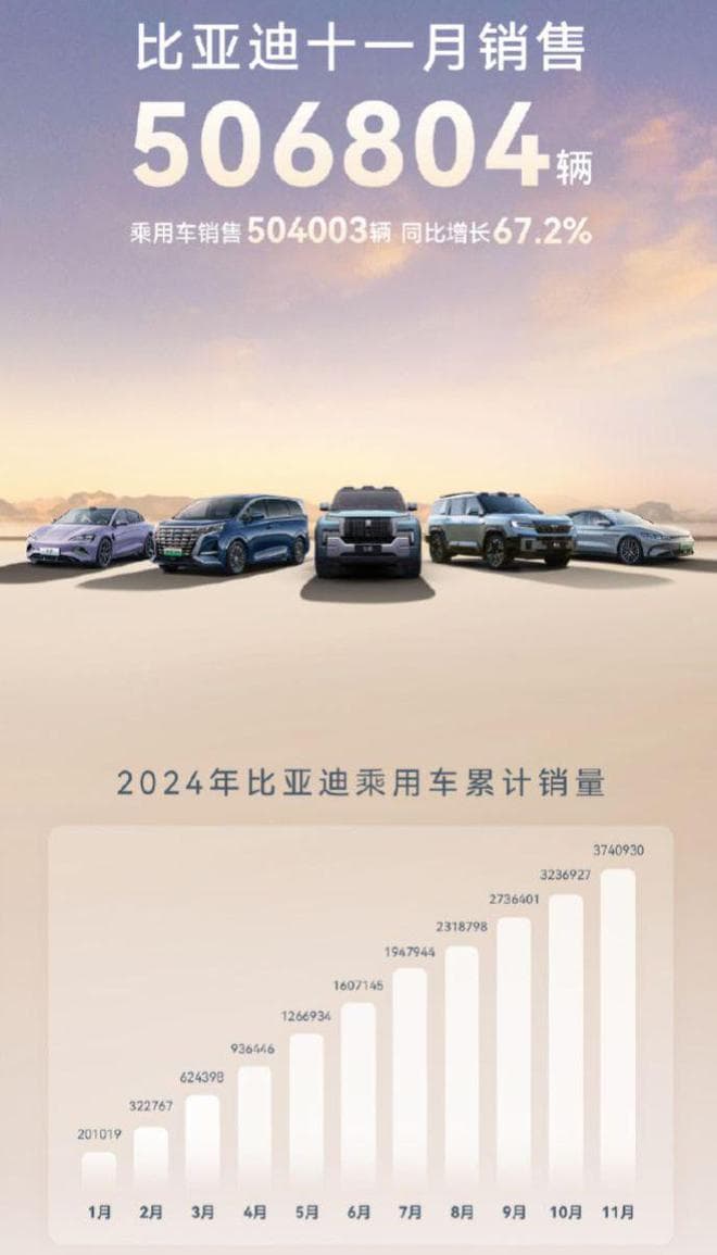 比亚迪11月销售506804辆,再创新高,其中,乘用车销量504003辆,同比增长67.2%。