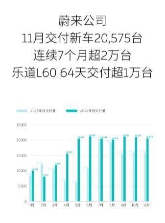 11月,蔚来公司交付新车20575台,连续7个月超2万台,乐道L60 64天交付超1万台。