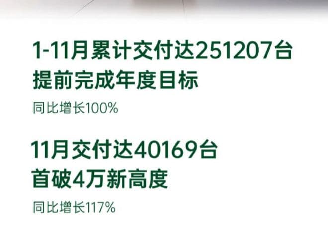 11月电车交付成绩单:比亚迪新能源车销量超50万,小鹏首破3万,赛力斯销量